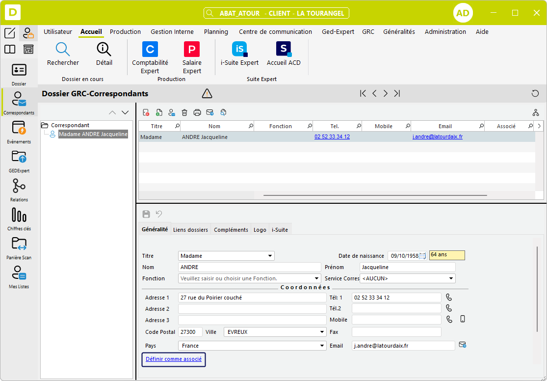 Dès lors que des correspondants existent déjà dans la fiche Fiche dossier de Dia Client, il suffit de définir la relation des associés directement depuis la fiche propre au Correspondant.