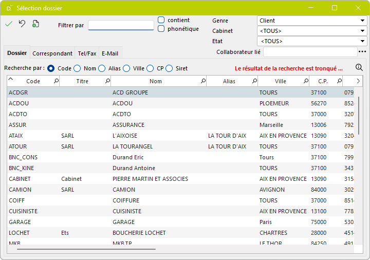 Si le dossier a été créé depuis Comptabilité Expert (menu Outils - Exportation - Création de la liste des dossiers dans Dia Client), alors la liste des Correspondants est automatiquement reprise dans Dia Client.
