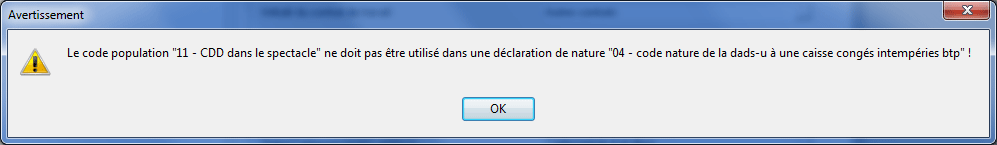 En CI-BTP, seuls les salariés ayant pour Code population "10 - salarié sous contrat de droit privé" sont pris en compte dans l'arborescence. Si vous tentez d'attribuer un autre code code population, un message d'avertissement apparaît :
