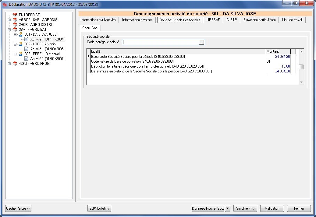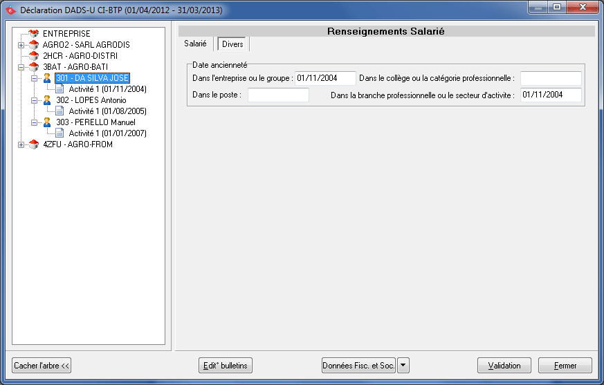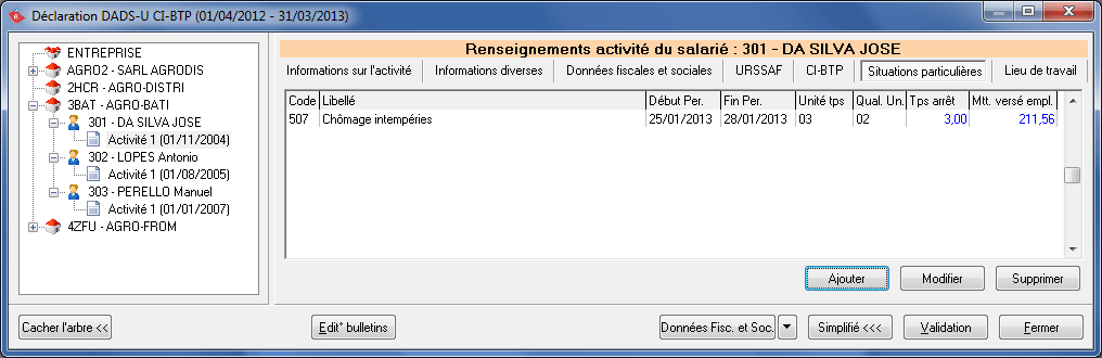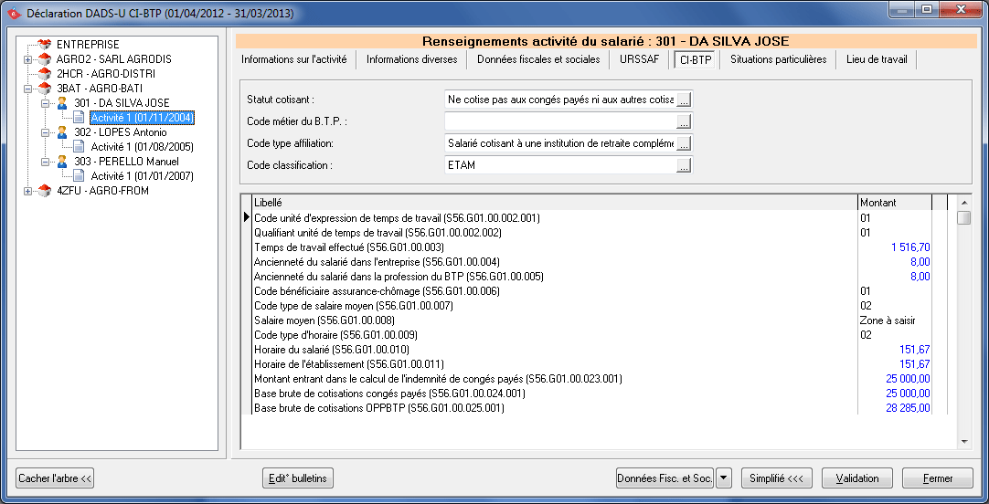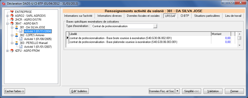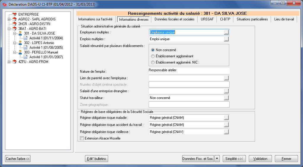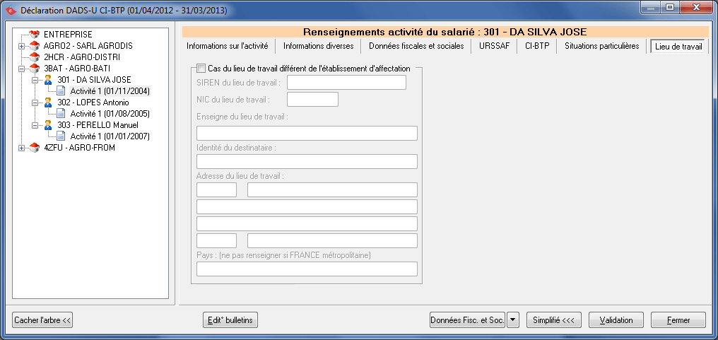 Cliquez sur le bouton Validation après avoir terminé de renseigner les différents onglets. Vous devez nécessairement valider vos dossiers pour pouvoir générer le fichier DADS-U à télétransmettre.