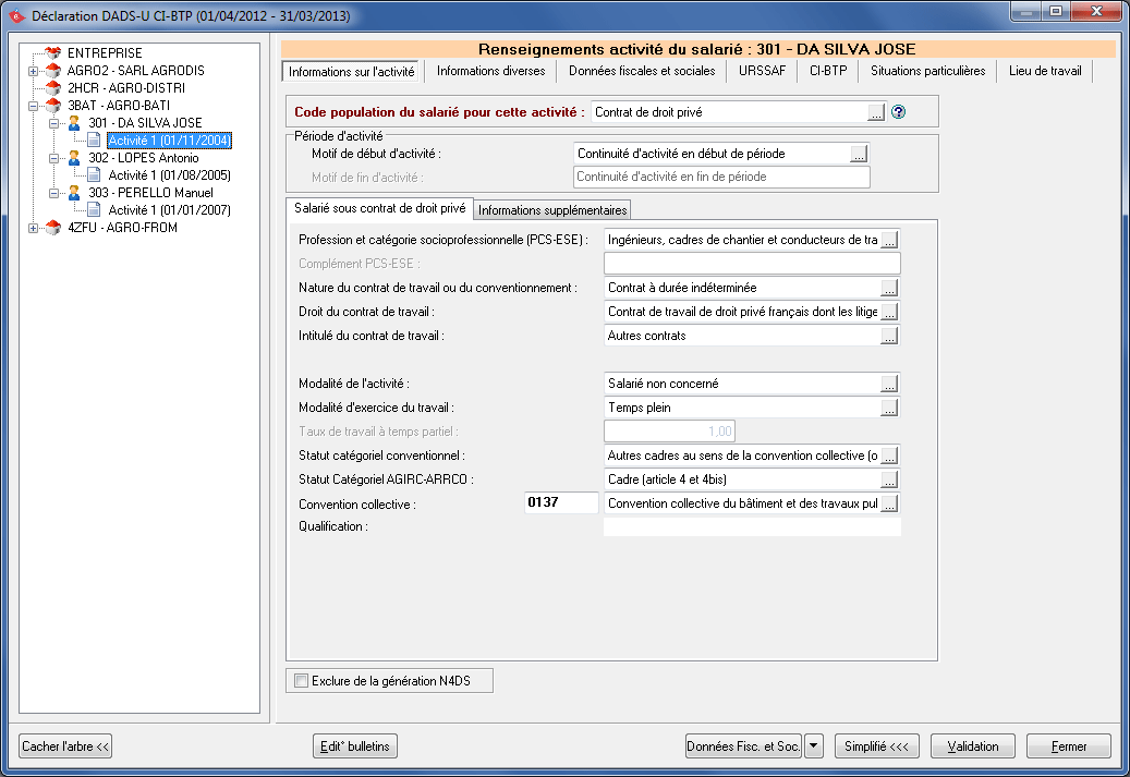 Les informations reprises dans les sous onglets Salariés sous contrat de droit privé et Informations supplémentaires sont préconisées par le Cahier Technique de la DADS-U en cours. Les modifications apportées dans ces onglets, modifient également les informations sur l'activité du salarié dans la Gestion Etablissements/Salariés.