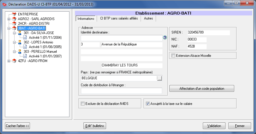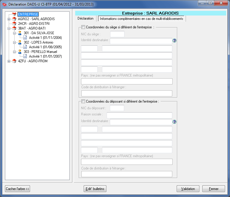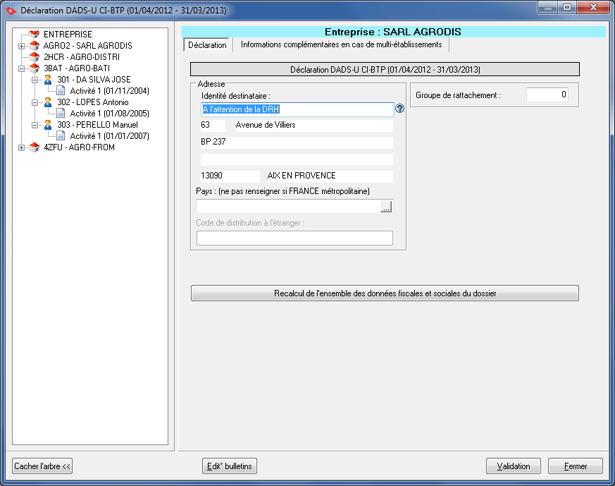Les coordonnées de l'établissement sont récupérées à partir des informations renseignées sur la fiche établissement accessible via le menu Gestion Entreprise, option Gestion Etablissements/salariés.