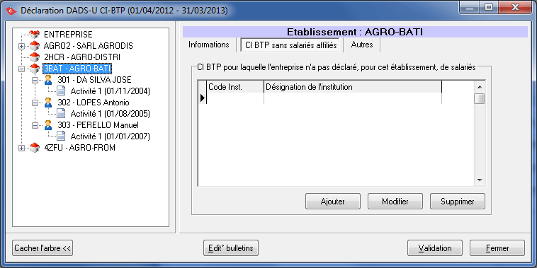 Cette fenêtre permet de déclarer la caisse de CI BTP, dans le cas où il n'y a aucun salarié déclaré.