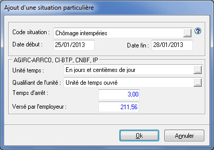 Si des évènements ont été saisis sur le bulletin du salarié avec un code Situation particulière, ceux-ci sont automatiquement repris dans cette fenêtre.