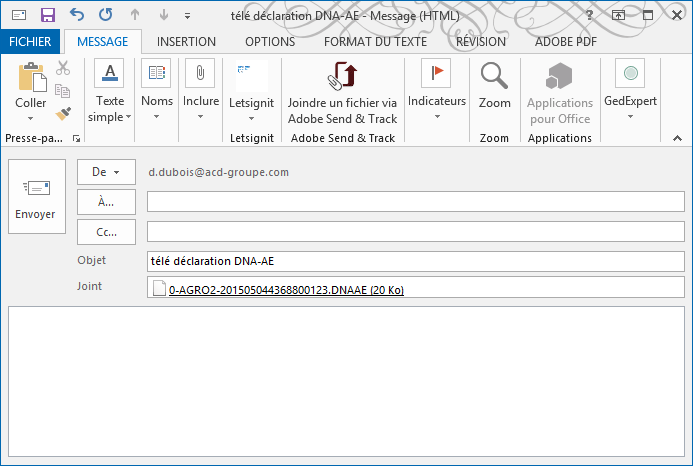 La messagerie apparaît automatiquement avec l'adresse du destinataire, renseignée au préalable au niveau des paramètres du Cabinet pour la Télétransmission et le fichier à transmettre. Le mail est prêt à être envoyé.