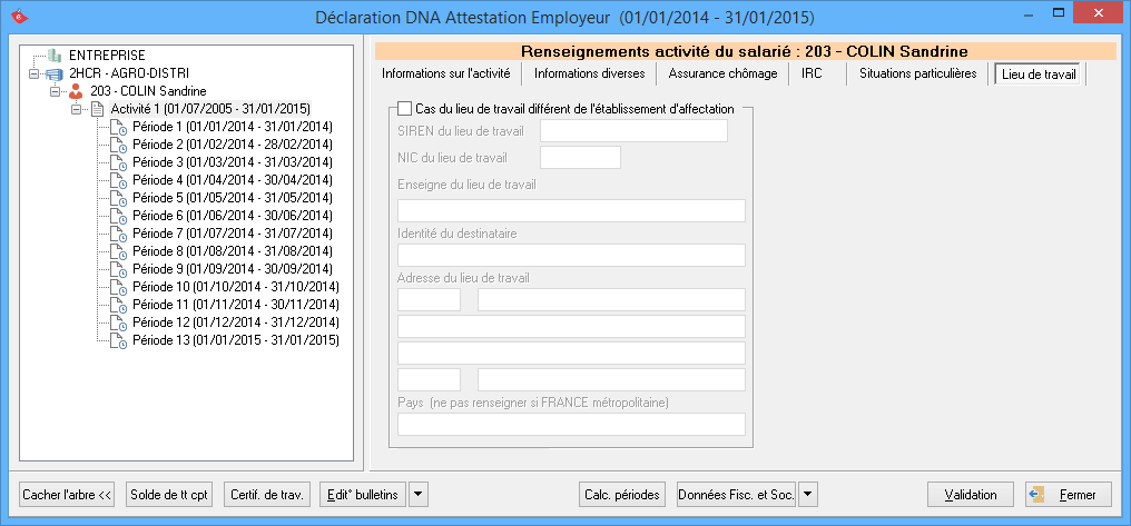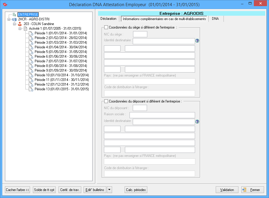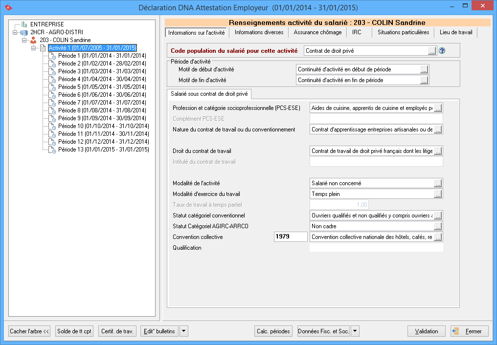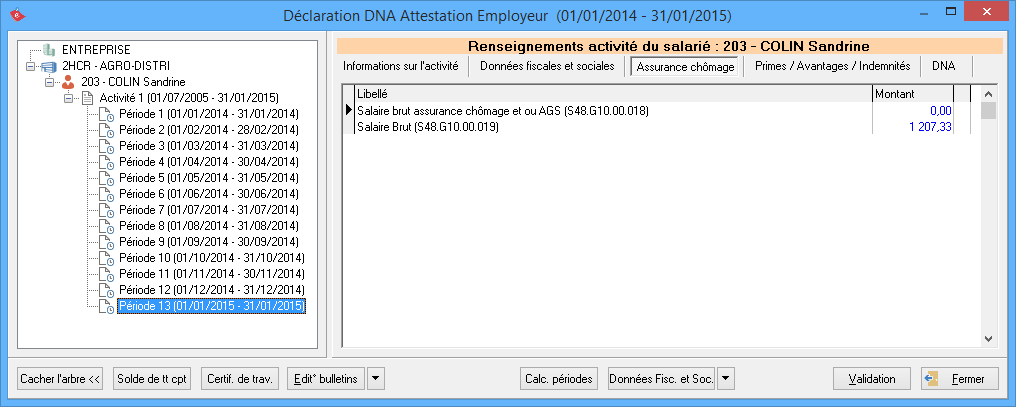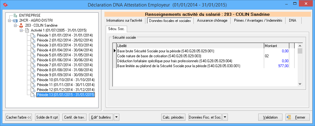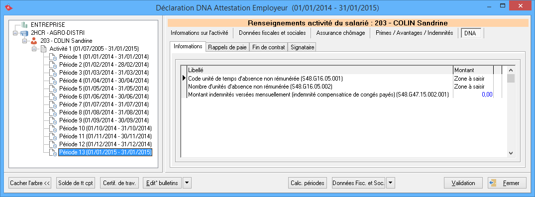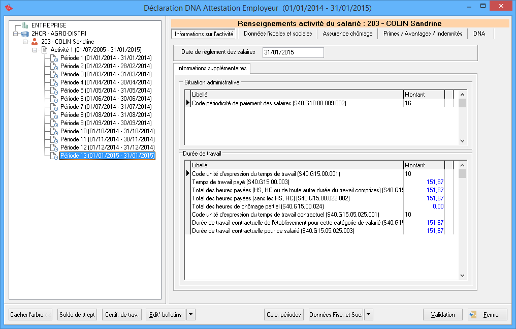 Sont reprises dans l'arborescence les périodes des 12 derniers mois trouvés qui ont été travaillés et payés, toutes activités confondues pour un même établissement. Pour chacune de ces périodes, sont repris des bulletins les éléments à déclarer relatifs au contrat du salarié (périodicité de paiement des salaires, durée du travail contractuelle de l'établissement et pour ce salarié....), à l'emploi (HS, HC, base brute sécurité sociale...).