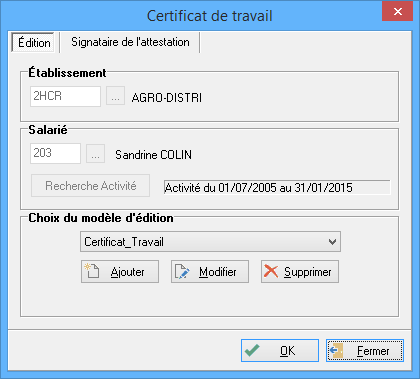 La fenêtre ci-dessous apparaît après avoir cliqué sur le bouton Attest. Emp., disponible dans la fiche Activité du salarié (menu Gestion Etablissements/Salariés) :