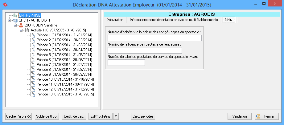 Cet onglet est réservé aux informations relatives aux intermittents du spectacle, à transmettre dans la DNA-AE :