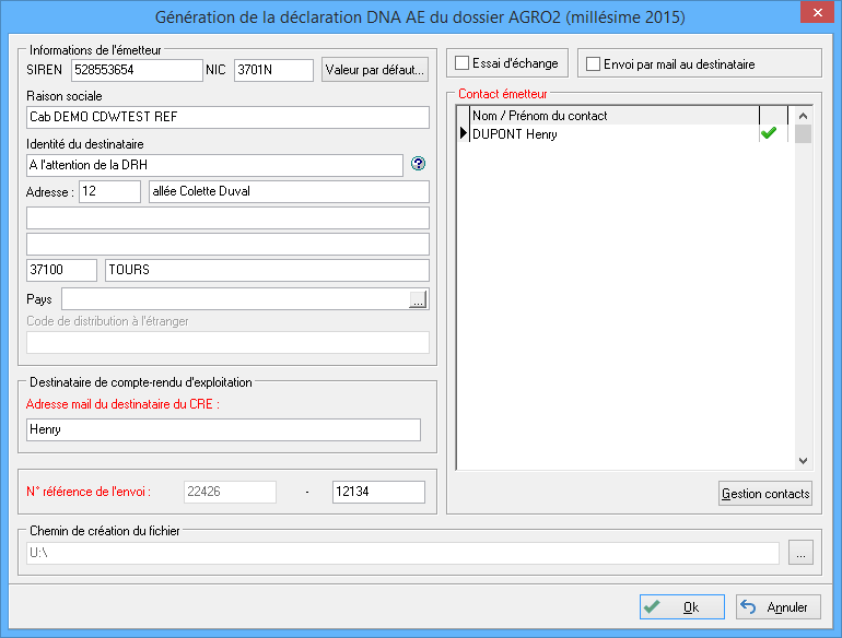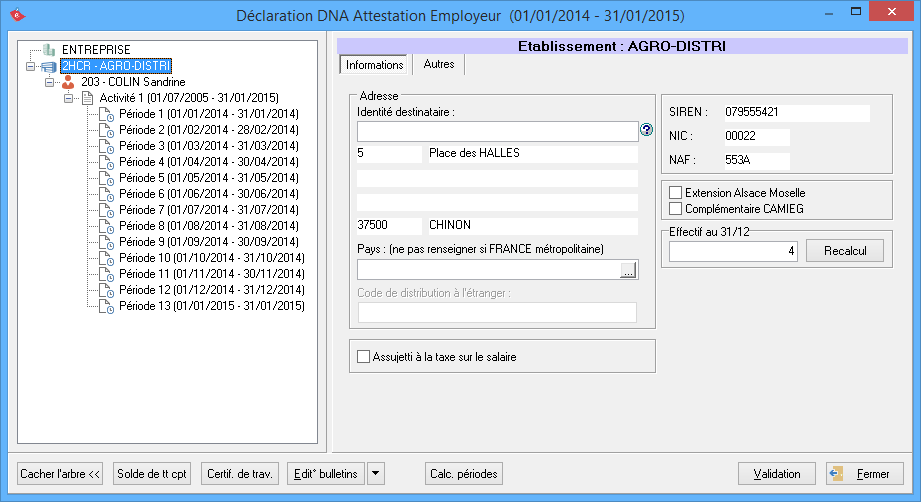 Les coordonnées de l'établissement sont récupérées à partir des informations renseignées sur la fiche établissement accessible via le menu Gestion Entreprise, option Gestion Etablissements/salariés.