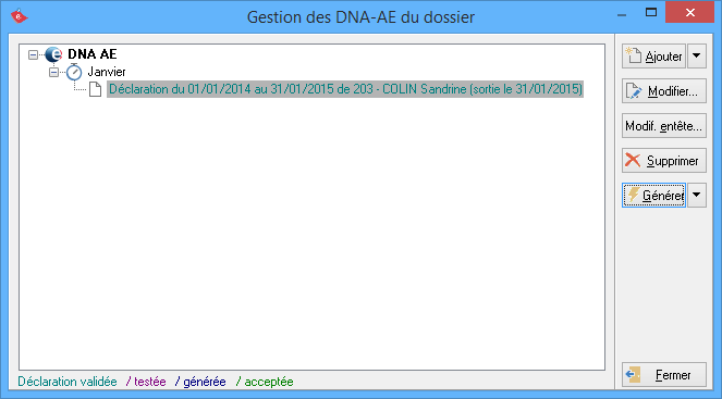 Une fois la déclaration créée, vous pouvez compléter ou modifier les informations reprises puis ressortir de la déclaration sans pour autant valider celle-ci en cliquant sur le bouton Fermer. Vous pouvez de nouveau accéder à la déclaration en allant dans la fonction Gestion des DNA-AE disponible dans le menu Traitements.