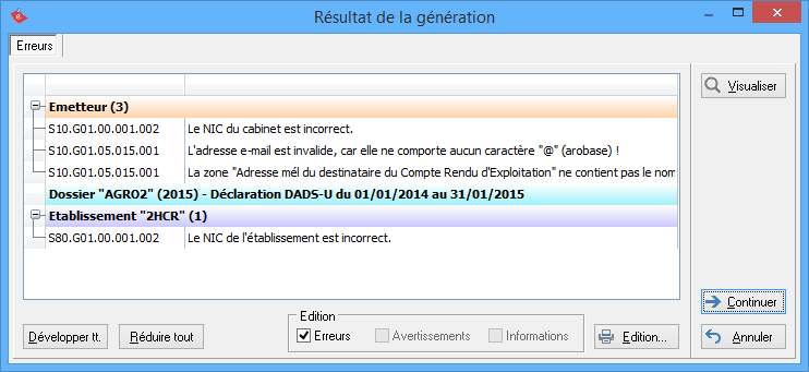 Lors de la génération du fichier une série de contrôle s'effectue. A l'issue de ce contrôle, une fenêtre affiche à l'écran la liste des erreurs qui ont été détectées. Cette fenêtre s'affiche aussi même si aucune erreur n'a été décelée.