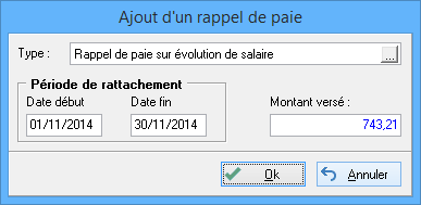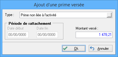 Lorsque celle-ci comprend une période de rattachement spécifique, le champ correspondant devient actif afin de pouvoir être renseigné. Puis précisez le Montant versé.