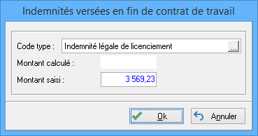 Cliquez sur le bouton de sélection afin de préciser le code Type d'indemnité proposée parmi la liste des diverses indemnités possibles, ainsi que le Montant saisi correspondant si besoin.