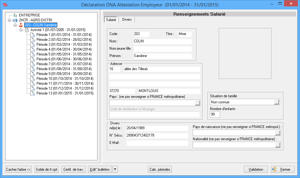 Dans la fenêtre de préparation de la déclaration, apparaissent les informations relatives à l'Entreprise, à l'Etablissement et au Salarié.