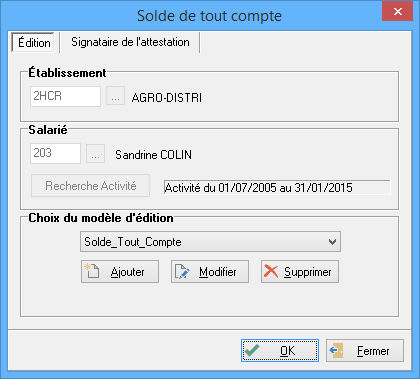 Après avoir cliqué sur le bouton Solde de tt cpt, vous accédez à la fenêtre de paramétrage de l'attestation pour l'activité en cours :