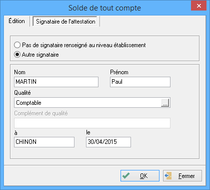 Cliquez sur l'onglet Signataire de l'attestation pour compléter les informations sur le signataire :