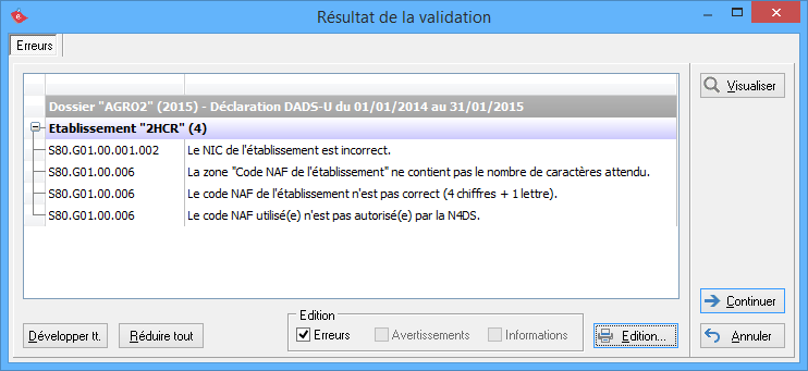 Vous avez la possibilité d'éditer la liste des anomalies en sélectionnant le ou les types d'anomalies puis en cliquant sur le bouton Edition. Pour poursuivre le traitement cliquez sur le bouton Continuer.