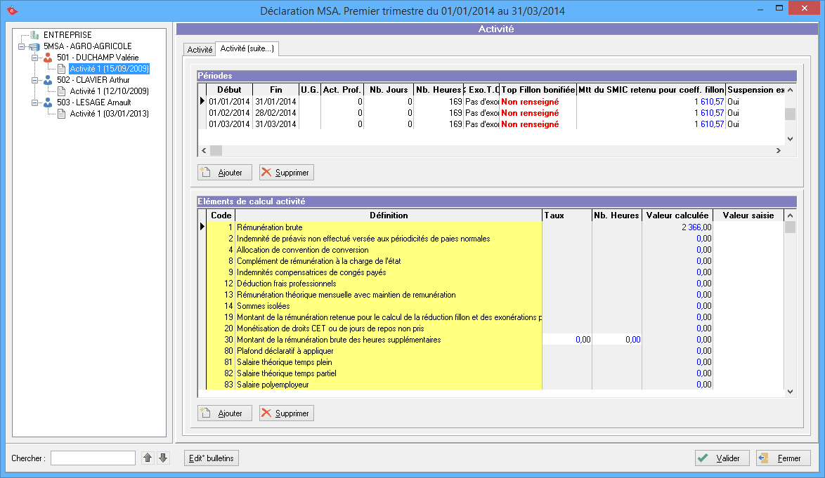 Pour chacune des périodes sélectionnées, apparaît le détail des lignes issues des bulletins calculés. Les valeurs calculées sont récupérées mais vous pouvez aussi saisir de nouvelles valeurs. Pour les périodes ajoutées, la colonne relative aux valeurs calculées est à 0.