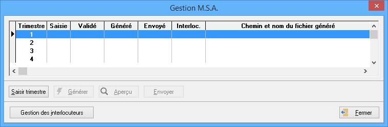 Cette fenêtre récapitule l'état de vos déclarations par trimestre. Lors de la première utilisation de cette fonction, le tableau est vide et seul le bouton Saisir trimestre est actif.