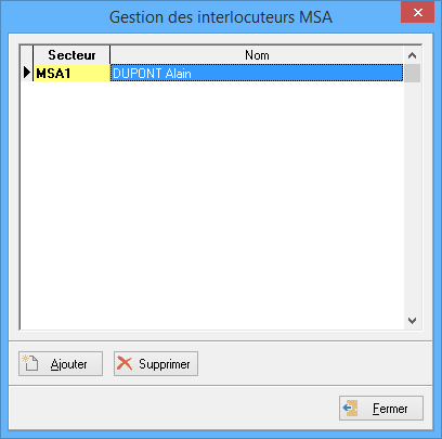 Cliquez sur le bouton Ajouter pour saisir votre interlocuteur MSA puis saisissez le secteur (4 caractères alphabétiques) correspondant à l'abréviation du nom du technicien destinataire du dossier puis son nom dans son intégralité. Vous avez la possibilité de supprimer un interlocuteur en cliquant sur le bouton prévu à cet effet. L'interlocuteur qui est renseigné est identifié par son secteur dans cette colonne.