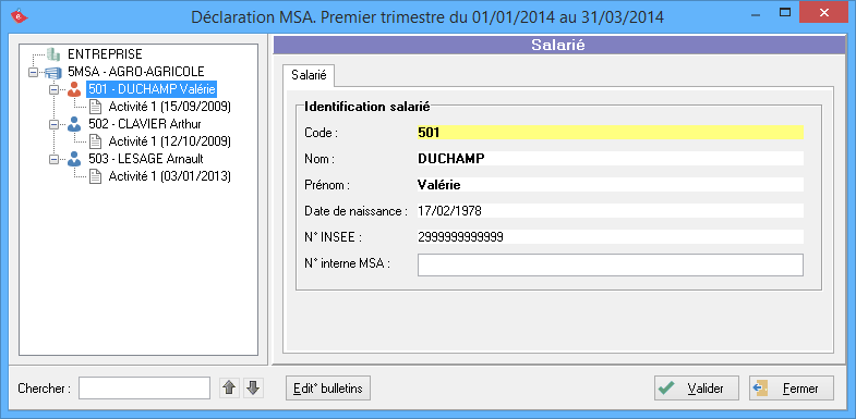 A ce niveau, le salarié est identifié par son N° INSEE (correspondant à son numéro de sécurité sociale) ainsi que différents éléments d'état civil (Nom, Prénom, Date de naissance). Ces zones ne sont pas modifiables car elles sont renseignées à partir des données fournies au niveau de la Gestion Etablissement et Salarié. Le N° interne MSA est le numéro identifiant du salarié attribué par la MSA. Reportez-vous à votre déclaration papier pour le renseigner sur cet écran. Il est composé de 13 caractères et débute par le code PROVIS.