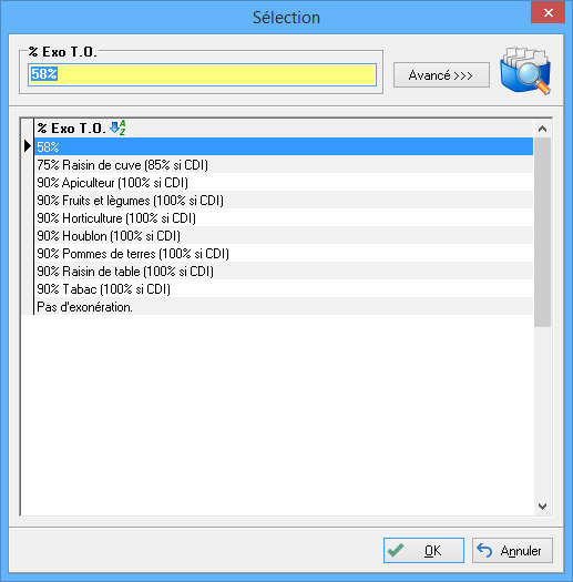 - % Exo TO : Cette colonne est à utiliser pour les groupements d'employeurs bénéficiant pour les travailleurs occasionnels d'une exonération qui est fonction de l'activité exercée par le salarié sur la période déclarée. Pour renseigner cette zone, double-cliquez sur cette colonne puis à l'aide des boutons de recherche, sélectionnez dans la fenêtre intermédiaire le pourcentage d'exonération à établir.