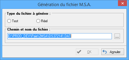 Sélectionnez le type de fichier à générer selon que vous envoyez à la MSA un fichier test ou un fichier réel. Le bouton Ok n'est actif que si le type de fichier est sélectionné.